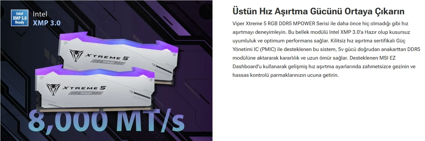 Viper Xtreme 5 RGB MPOWER serisi ve MSI Z790 MPOWER anakartın rakipsiz birleşimi ile daha önce hiç olmadığı gibi bir bilgisayar deneyimine başlayın; 8.000MT/s'ye varan hızlarla üstün performans sunar. 48GB (24GBx2) veya 32GB (16GBx2) kapasitelerden birini seçin ve Viper ile MSI'ın patlayıcı sinerjisine tanık olun; bu güçlü işbirliği, sisteminizin yeteneklerini benzeri görülmemiş boyutlara yükseltir.