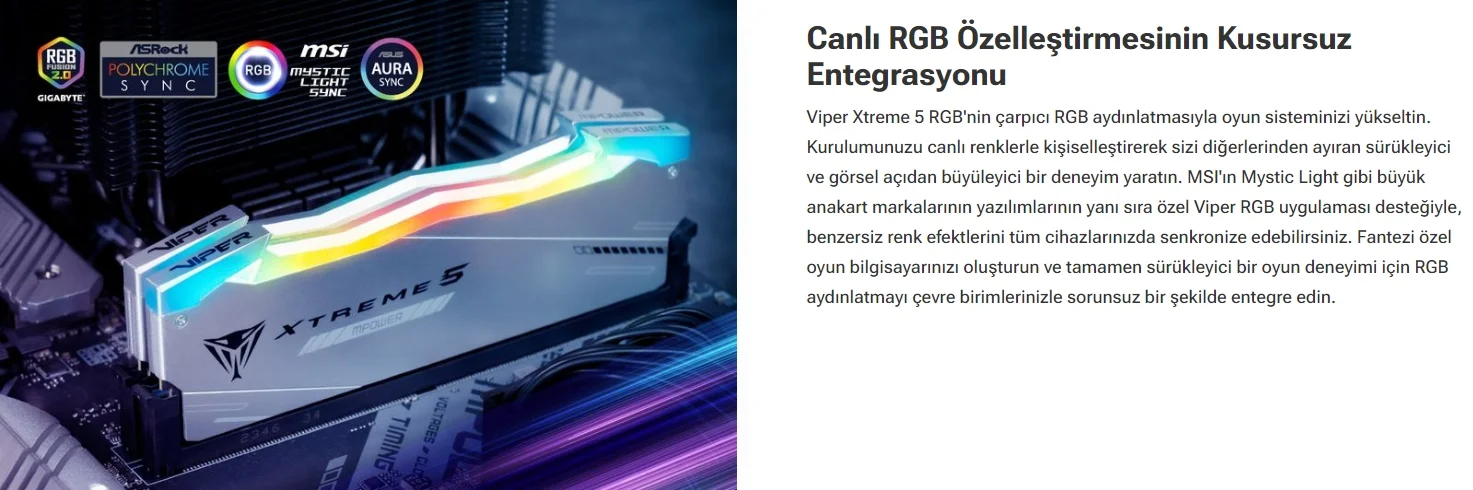 Alüminyumdan dövülmüş ve kalite güvencesi açısından titizlikle elle test edilmiş olan Viper Xtreme 5 RGB DDR5 MPOWER Serisi, hassas mühendisliğin bir kanıtıdır. Oyun ve hız aşırtmadan içerik oluşturma gibi daha ciddi görevlere kadar bilgi işlemin her alanında üstün performans sergilemek üzere tasarlanan her bileşen, benzersiz bir kullanıcı deneyimi sağlayarak sarsılmaz performans ve güvenilirlik sunar.