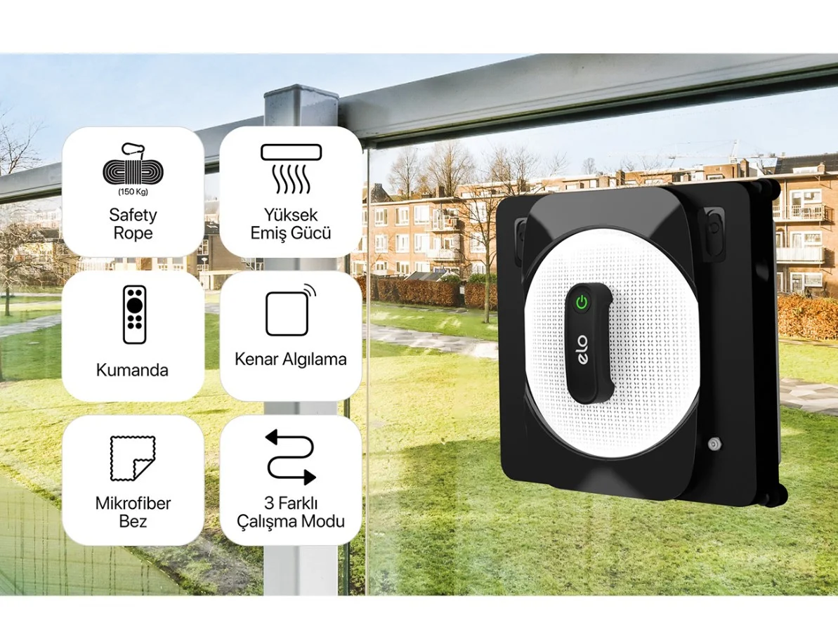 1 m² alanı 1,1 dakikada temizleyen Elo Cam Temizleme Robotu, 64 dB’lik gürültü seviyesine sahiptir.