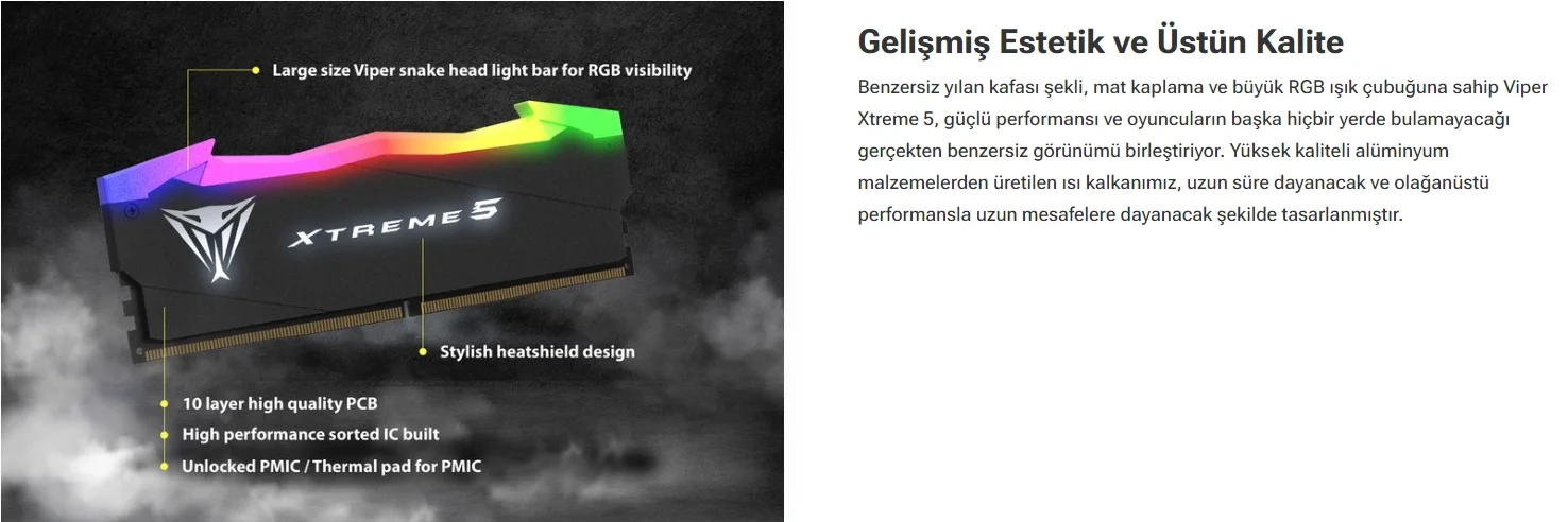 Viper Xtreme 5 DDR5 kitiyle donanımınızın estetiğini yükseltin. Dinamik RGB ışık çubuğu yalnızca aydınlatma değil, aynı zamanda sanatsal bir tuvaldir. Uyumlu bir kurulum için Viper RGB Sync'i kullanarak aydınlatma efektlerini senkronize edin. RGB olmayanı mı tercih ediyorsunuz? Çeşit ile gelişmişliği seçin. Oyun deneyiminizi yeniden tanımlamak için yeniliği, kişiselleştirmeyi ve performansı açığa çıkarın.